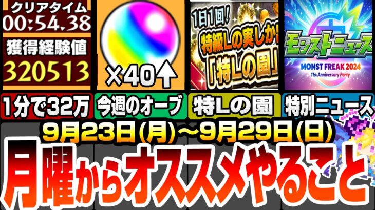 9月23日(月)~29日(日)のやることオススメです。1分で経験値32万でランク上げがヤバイ!特Lの園が開催!厳選が超捗るぞ!消費スタミナ1/2とノーコンでわくわくの実2個キャンペも熱い!今週のオーブは40個以上!新黎絶 アブピッシャーも降臨!モンストフリーク2024で特別なモンストニュース!獣神化改や真獣神化、新しいコラボ発表がくる?シャングリラ・フロンティアコラボも新しい超究極がくるか?アップデートVer28.2も来るぞ!