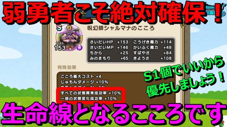無課金・家族持ち・サラリーマン勇者が考える最優先のこころです!シャルマナのこころは優先して絶対確保しましょう!状態異常・状態変化の成功率が上がるこころは火力で押し切れない勇者にとって生命線なのです!こういうこころが揃えばだいたい勝てます!